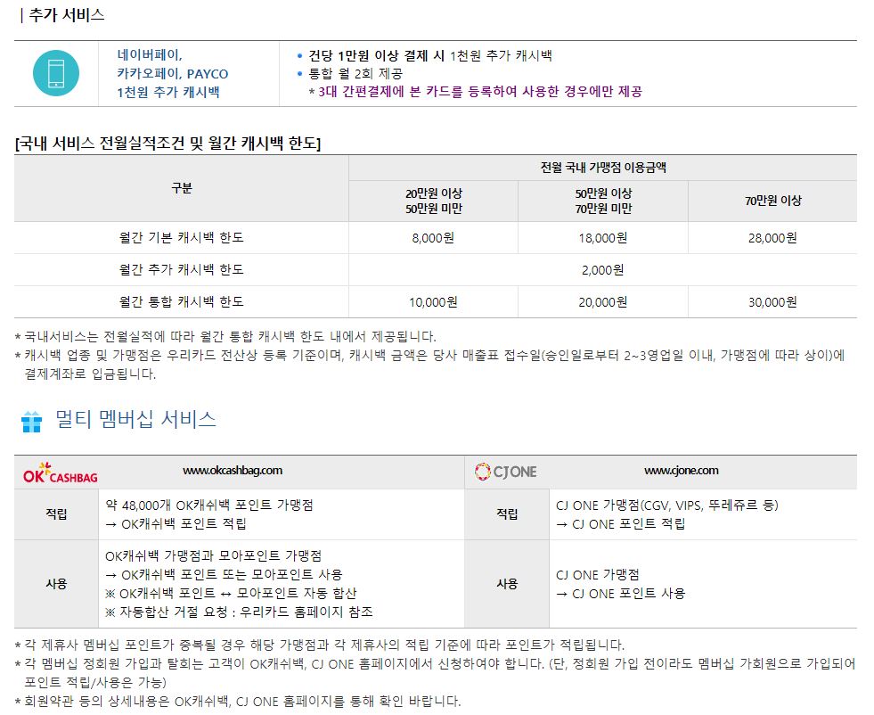해외 이용 수수료 면제를 제외하고는 전월 20만원 이상 실적이 필요한 점 참고 부탁드립니다. 추가적으로 우리카드 홈페이지에서 바로 체크카드를 발급받으셔도 되지만, PAYCO 앱을 통해 대상 카드를 신규 발급 후 이벤트 기간 동안 건당 5천원 이상 PAYCO결제시 2만 포인트 적립되는 이벤트도 있습니다. (단, 우리카드 체크 신규회원에 한함) 자세한 내용은 PAYCO APP을 참고 부탁드립니다. (2020.05.01 - 2020.05.31)